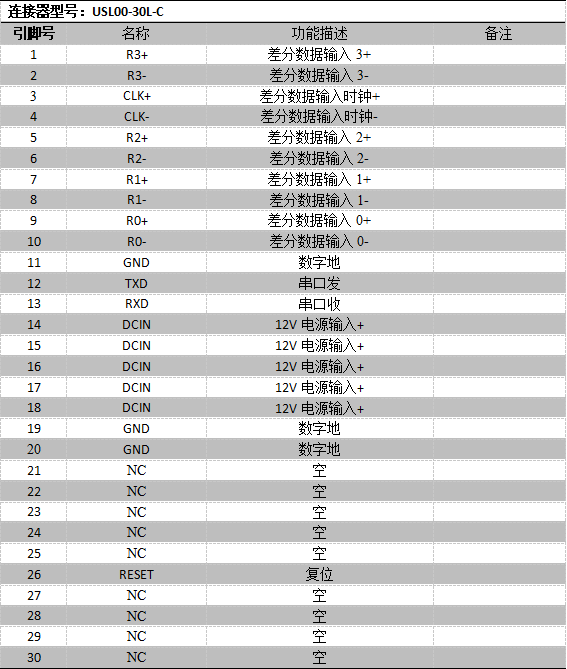 输入:LVDS 4通道(CLK+,CLK-,R0+,R0-,R1+,R1-,R2+,R2-,R3+,R3-)。