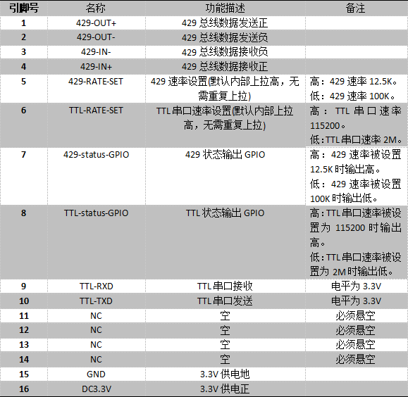 TTL接口:电平3.3V(速率11520和2M可配、1位起始位、8位数据位、1位停止位、无校验位)。