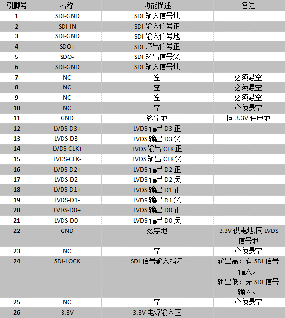 注1:SDI输入可以有2种方式,模块第2脚或模组SDI-IN连接器(IPEX),二者只能选取一种,不能同时使用。