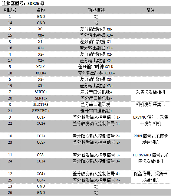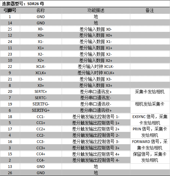3.输出接口Base-OUT1/Base-OUT2(SDR26母)定义(采集卡为MDR26使用SDR26公转MDR26公即可):